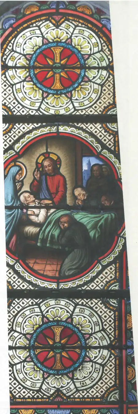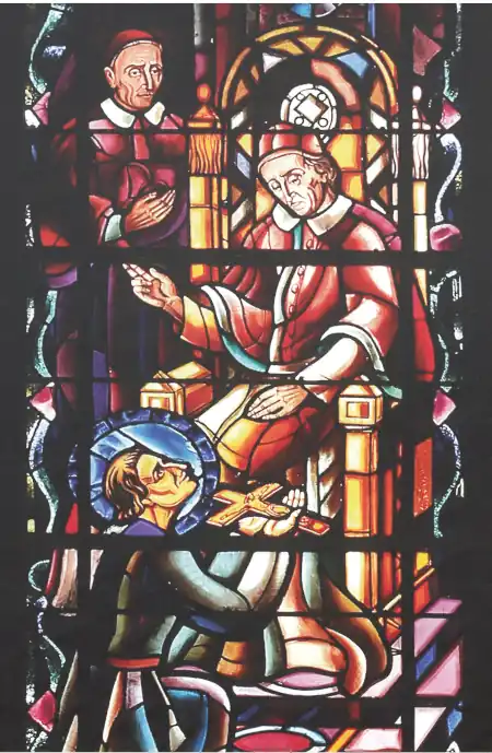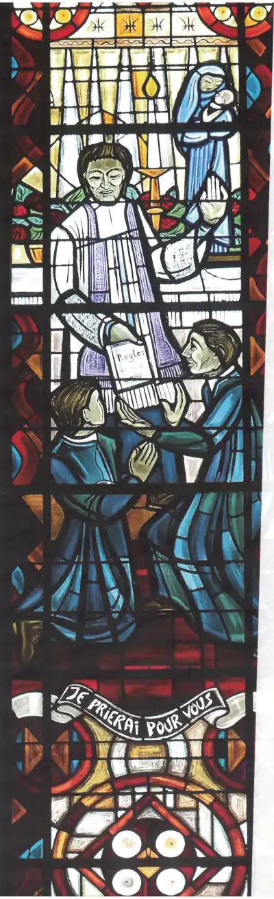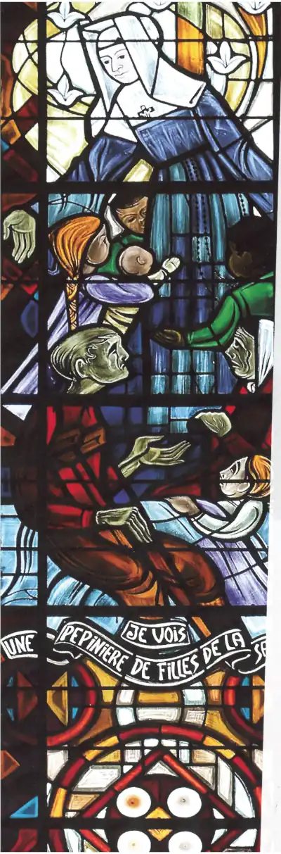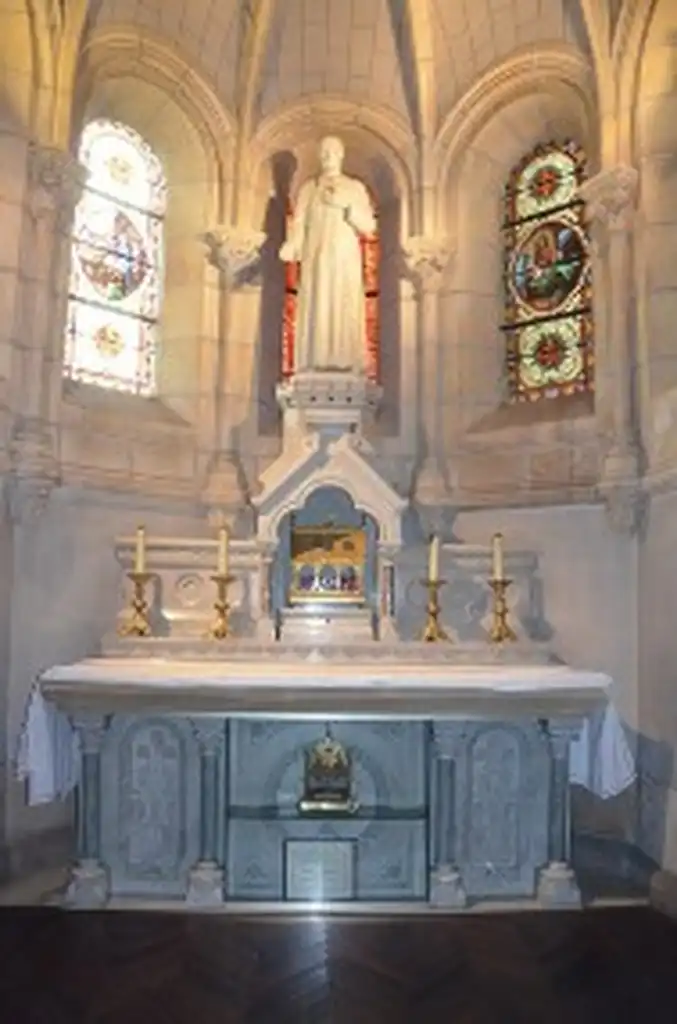 A gauche, un tableau de Claudius Lavergne (don du pape Léon XIII) représente Louis-Marie donnant l’habit religieux à la Sœur Marie-Louise Trichet en présence (symbolique, mais anachronique) du Père Mulot et du Frère Mathurin.