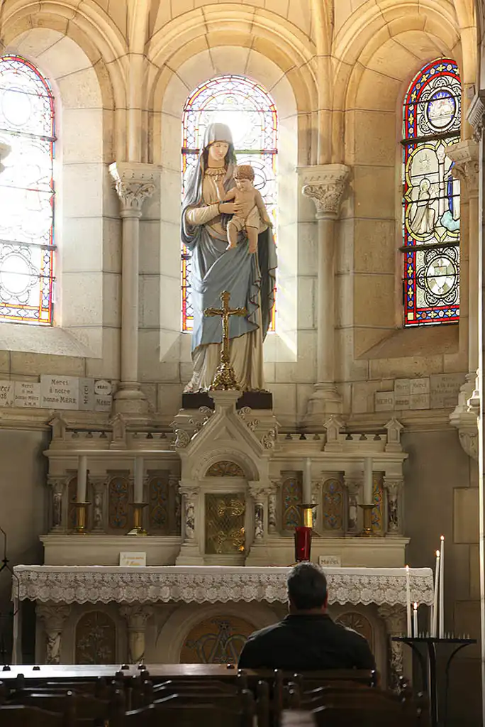 La chapelle du Saint Sacrement également dédié à Marie. La statue de la Vierge vient de l’ancienne église. Elle aurait été vénérée par le P. de Monfort.